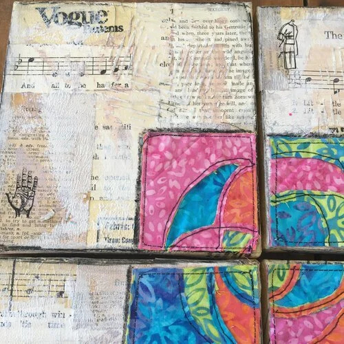 Cleaning out my supplies and downsizing is a struggle I have. These 6”x"6” canvases ( eight of them) have been taking up space in my cupboard for years. Last week I decided to use them in a reverse appliqué project.