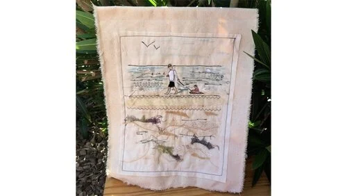 Little pieces of fabrics were cut for the parts of the design. This part is a bit fussy but I only had 4 little pieces. I also added fiber and scrapes of fabric to the sand.